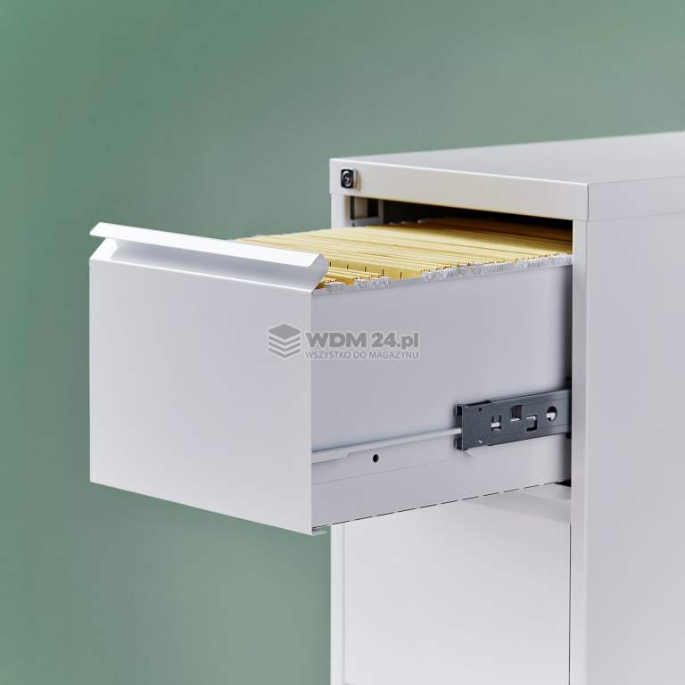Wysokiej jakości szafa na dokumenty A4. W pełni spawana konstrukcja korpusu i szuflad. Wyposażona w mechanizm zapobiegający utracie stabilności i przewróceniu. Oferuje centralny zamek i dwa klucze. Szuflady wysuwają się całkowicie, a każda z nich mieści około 65 zawieszanych teczek w formacie A4. Wysokiej jakości stalowa szafa pomoże lepiej zorganizować przechowywanie teczek zawieszanych - doskonała jako szafka kartotekowa w biurze. Szafa na dokumenty doskonale nadaje się do przechowywania m.in. dokumentów, umów, korespondencji i raportów. Szafa oferuje cztery duże szuflady, które służą do zawieszania teczek w formacie A4. Każda szuflada pomieści około 65 teczek w formacie A4.