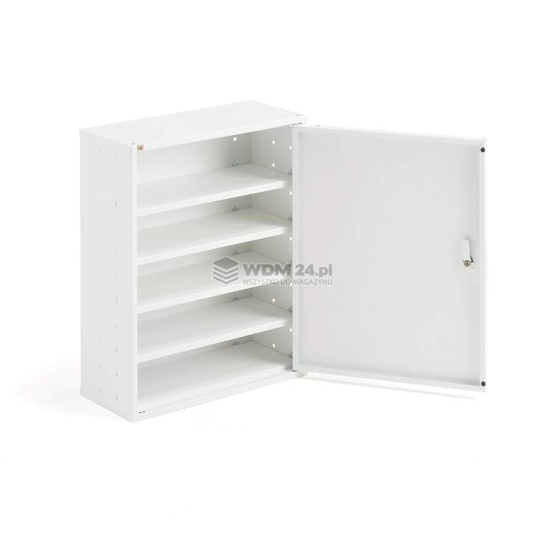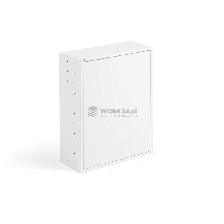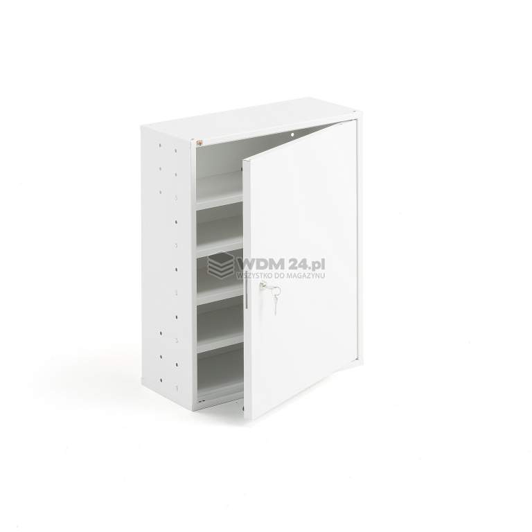 Kompaktowa i wygodna w użytkowaniu szafka, którą można zamontować na dowolnej wysokości na ścianie lub ustawić na półce lub blacie. Cztery regulowane półki umożliwiają dostosowanie szafki do własnych potrzeb. Mebel zajmuje minimalną przestrzeń i idealnie nadaje się do przechowywania kosztowności, narzędzi, artykułów biurowych, ważnych dokumentów i wielu innych rzeczy! Szafka jest wykonana z blachy malowanej proszkowo na kolor biały, i jest solidna oraz wytrzymała. Została wyposażona w zamek cylindryczny z dwoma kluczami, co zapewnia bezpieczne przechowywanie zawartości. Otwarcie szafki następuje przez przekręcenie klucza w zamku zamontowanym w metalowych drzwiach. Klucz w zamku służy również jako klamka. Dzięki temu uchwyty nie przeszkadzają i nie zajmują niepotrzebnej przestrzeni.