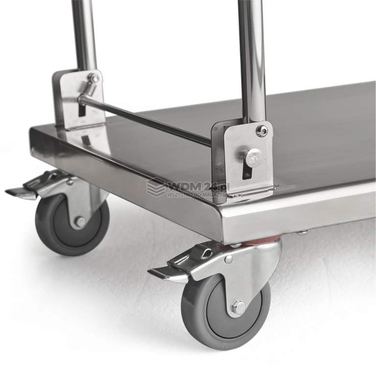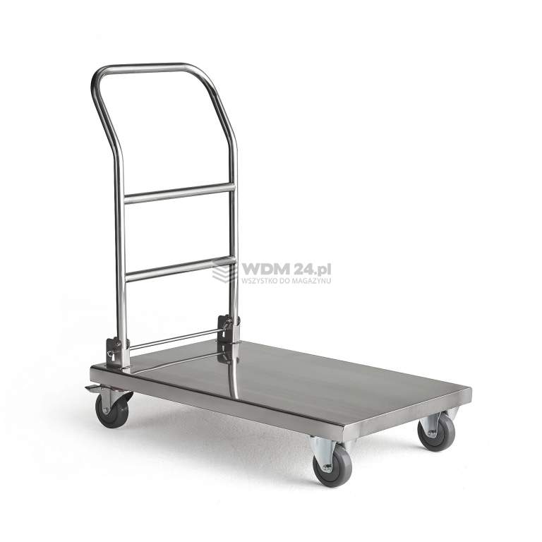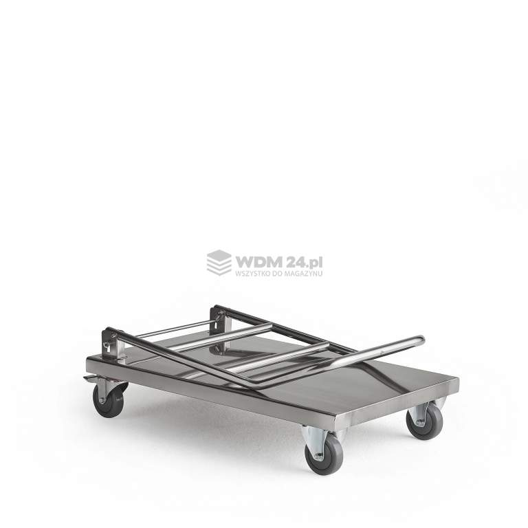 Praktyczny wózek platformowy ze stali nierdzewnej ze składanym uchwytem i niską, płaską platformą, która jest łatwa do wyczyszczenia. Doskonały do miejsc, gdzie czystość i higiena to priorytety. Po złożeniu uchwytu wózek zajmuje niewiele miejsca. Wózek to doskonałe rozwiązanie do stołówek, kuchni, restauracji, hoteli i innych miejsc, gdzie higiena jest priorytetem. Wózek jest łatwy w obsłudze i funkcjonalny. Zajmuje niewiele miejsca dzięki składanemu uchwytowi. Wykonany ze stali nierdzewnej, która jest niezwykle trwała i higieniczna. Niska półka posiada gładką powierzchnię, co sprawia, że jest łatwa w czyszczeniu. Wózek platformowy sprawdzi się podczas transportu jedzenia, naczyń kuchennych oraz dużych elementów, takich jak garnki, rondle, patelnie itp. Wózek łatwo przechować - wystarczy złożyć uchwyt i odstawić, gdy nie jest używany. Cztery koła skrętne sprawiają, że wózek jest łatwy w manewrowaniu. Dwa koła można zablokować, uniemożliwiając wózkowi odjeżdzanie podcas załadunku i rozładunku. Maksymalne równomierne obciążenie 100 kg.