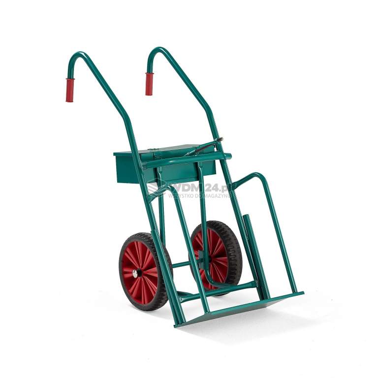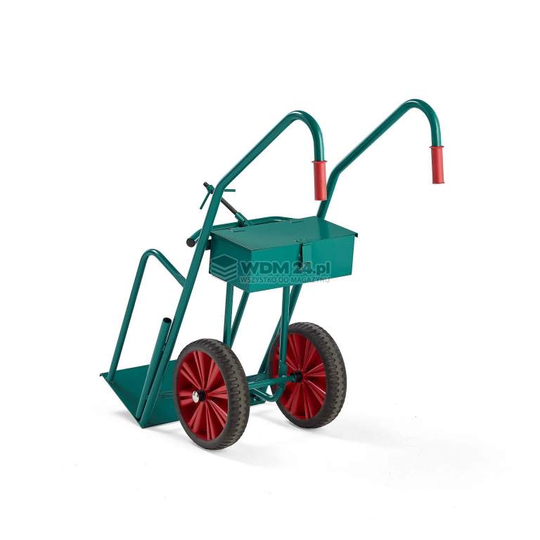 Poręczny wózek z miejscem na dwie duże butle gazowe. Wózek posiada ergonomiczne uchwyty, duży schowek oraz dwa solidne koła, które ułatwiają pokonywanie progów i innych przeszkód. Wózek jest wykonany z wytrzymałych rur stalowych lakierowanych proszkowo. Umożliwia łatwe i wygodne przemieszczanie butli gazowych. Ergonomiczne uchwyty są solidne i wygodne oraz ułatwiają manewrowanie. Wózek na butle z gazem jest również wyposażony w stalowy pojemnik pomiędzy uchwytami, który zapewnia łatwo dostępne miejsce do przechowywania podczas przenoszenia butli gazowych.