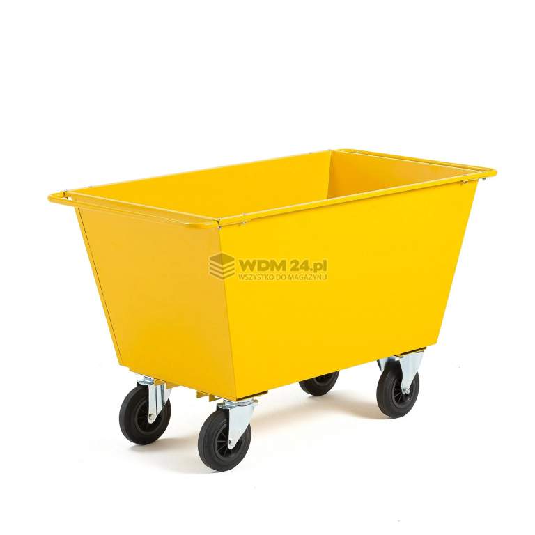 Duży mobilny kontener z blachy stalowej lakierowanej proszkowo, wyposażony w wygodne uchwyty do prowadzenia. Wózek doskonały do użytkowania w magazynach, zakładach przemysłowych, ogrodach lub np. do rozwożenia karmy w stadninie itp. Pojemny i łatwy w obsłudze wózek na odpady zaprojektowany do transportu śmieci, odpadów i innych przedmiotów obecnych na placach budowy.
