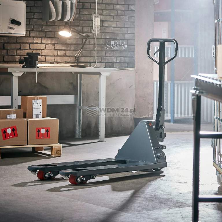 Wózek paletowy z funkcją szybkiego podnoszenia (Quicklift) i ergonomicznym uchwytem. Promień skrętu 220˚ sprawia, że wózek jest łatwy w manewrowaniu. Praktyczny wózek paletowy z funkcją szybkiego podnoszenia Quicklift, która sprawia, że jest niezwykle wygodny w obsłudze. Widły dosięgają palety przy pierwszym skoku pompy, przy drugim skoku pompy unoszą paletę. Automatyczny powrót do normalnej prędkości podnoszenia przy obciążeniu większym niż 150 kg. Promień skrętu 220˚ ułatwia manewrowanie wózkiem. Rolki frontowe ułatwiają załadunek i rozładunek palet. Wózek paletowy posiada oznaczenie CE.