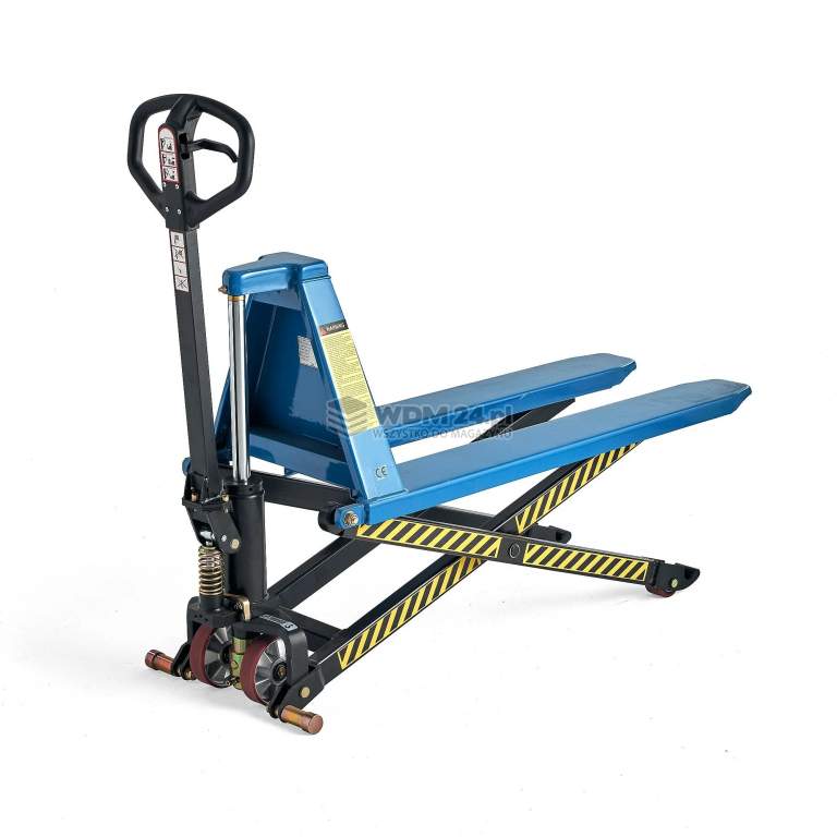 Łatwy w użyciu wózek paletowy wysokiego podnoszenia, który może być również używany jako stół podnoszący. Łatwy w użyciu wózek paletowy wysokiego podnoszenia, który może być również używany jako stół podnoszący. Wózek posiada punkty smarne i tuleje ułatwiające konserwację. Podnoszenie przez pompowanie sterownicą, opuszczanie dźwignią w uchwycie. Wózek nożycowy zapewnia bezstopniowe opuszczanie nawet przy maksymalnym obciążeniu.