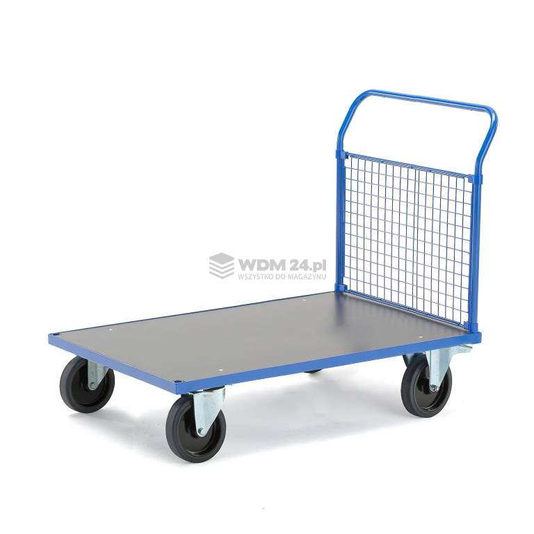 Wózek z platformą wykonaną z płyty MDF i niską ramą końcową z panelem z siatki na krótszym boku. Doskonały do przechowywania i transportu towarów. Ramę oraz panel z siatki można łatwo zdjąć, co umożliwia transport większych przedmiotów. Wyposażony w dwa koła stałe i dwa skrętne. Trwały wózek platformowy do transportu i przechowywania w magazynach, warsztatach i innych środowiskach przemysłowych. Wózek transportowy jest także doskonałym rozwiązaniem do środowisk nieprzemysłowych, takich jak biura, centra sportowe itp. Zdejmowany panel z siatki pozwala łatwo dostosować wózek do potrzeb w zakresie przechowywania.