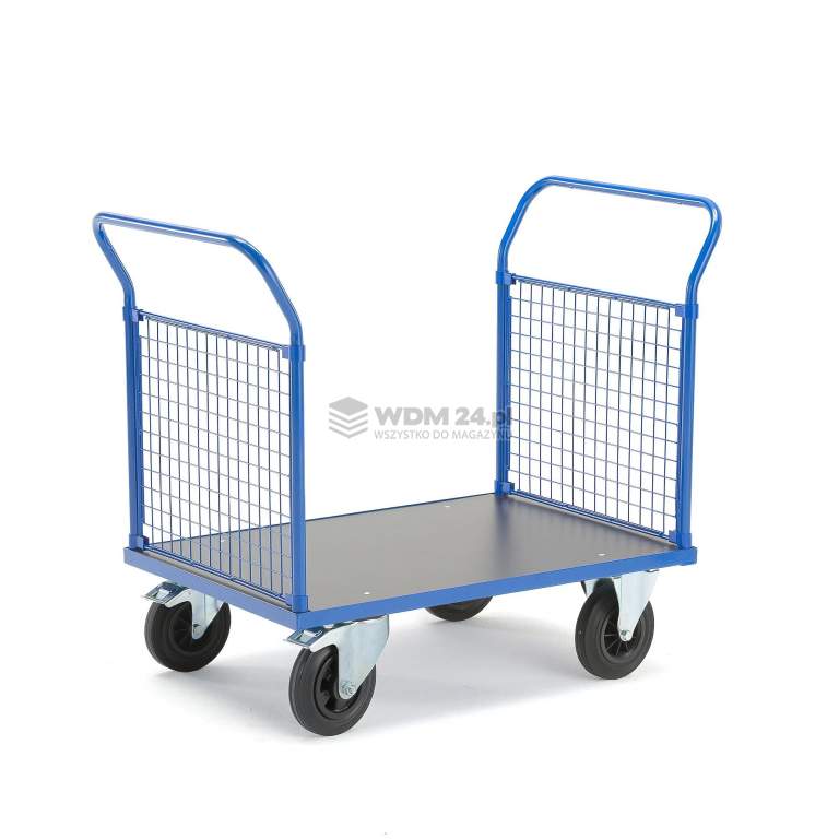 Wózek platformowy z niskimi ramami końcowymi i panelami z siatki na krótszych bokach. Zdejmowane ramy i panele z siatki pozwalają łatwo dostosować wózek do potrzeb w zakresie transportu. Łatwa obsługa nawet przy maksymalnym załadowaniu. Trwały wózek platformowy do transportu i przechowywania w magazynach, warsztatach i innych środowiskach przemysłowych. Wózek transportowy jest także doskonałym rozwiązaniem do środowisk nieprzemysłowych, takich jak biura, centra sportowe itp. Zdejmowane panele z siatki pozwalają łatwo dostosować wózek do potrzeb w zakresie przechowywania.