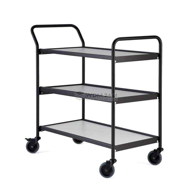 Wielofunkcyjny wózek z 2 uchwytami i dwustronnymi półkami. Sprawdzi się podczas transportu w środowisku biurowym i przemysłowym. Praktyczny, wszechstronny wózek stołowy, idealny do transportu w środowisku biurowym i przemysłowym. Powierzchnia z laminatu jest trwała i łatwa do wyczyszczenia. Wózek posiada stylową ramę malowaną proszkowo na kolor czarny. Lakier teksturowany. Sprzęt posiada dwa uchwyty dla łatwego manewrowania. Maksymalny udźwig wózka to 150 kg, co pozwala używać go do większości zadań transportowych.