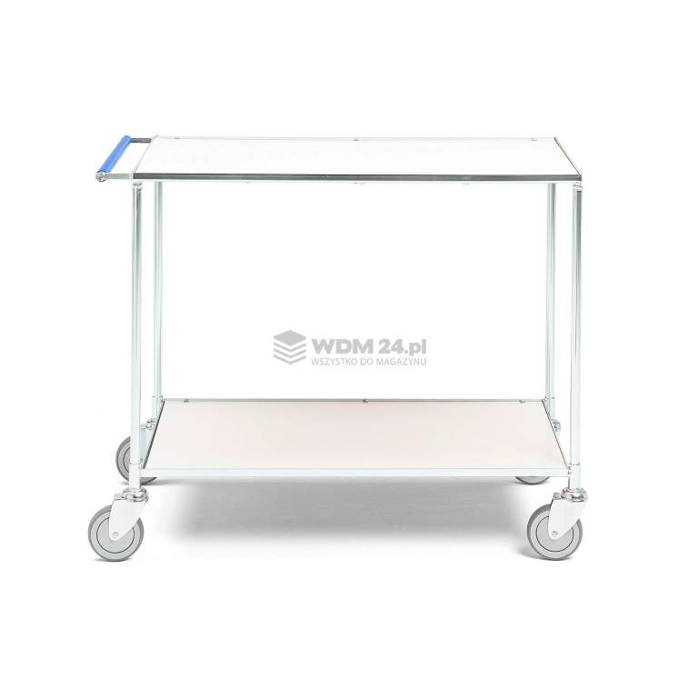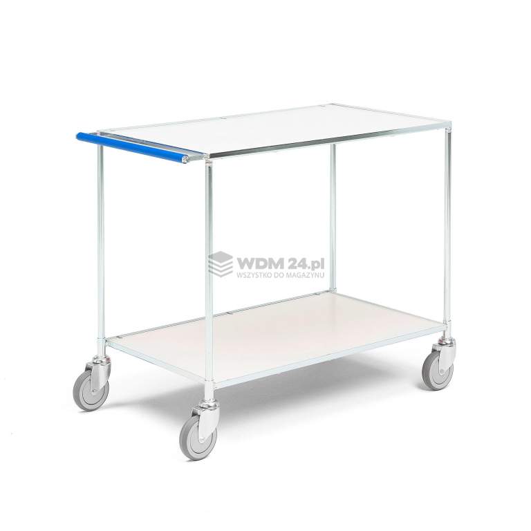 Elegancki i klasyczny wózek stołowy z wytrzymałymi półkami i wygodnymi uchwytami. Wózek nadaje się do warsztatów i środowisk przemysłowych oraz biur. Wszechstronny wózek z półkami. Niezwykle mocny i wytrzymały. Trwała konstrukcja z rur stalowych i dwie półki z tworzywa Formica czynią wózek niezwykle wytrzymałym. Wygodny uchwyt sprawia, że łatwo manewrować wózkiem. Uchwyt znajduje się na tej samej wysokości co górna półka, co pozwala przewozić dłuższe ładunki. Dolna półka zapewnia miejsce ogólnego przechowywania i posiada cztery koła skrętne na łożyskach kulkowych.