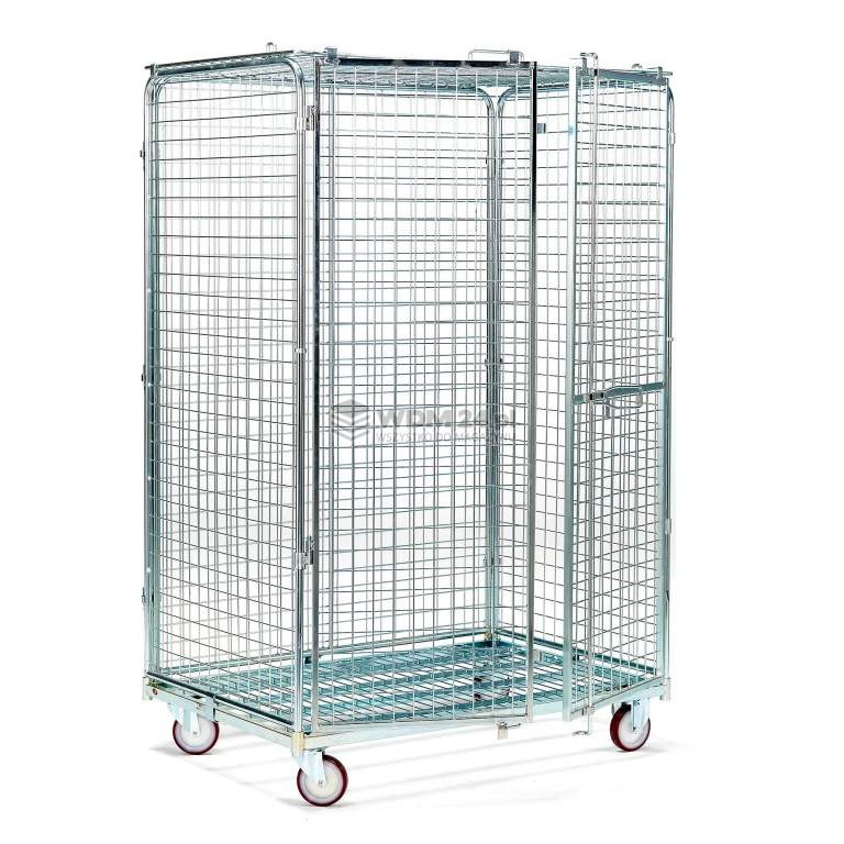 Rollkontener z czterema ścianami, dwiema zamykanymi furtkami i pokrywą w górnej części. Galwanizowany elektrolitycznie rollkontener z czterma ścianami, górną klapą i dwiema trwałymi zamykanymi furtkami. Podczas zamykania furtki blokują również dno i klapę. Można dodatkowo wyposażyć w kłódkę. Wózek jest wyposażony w dwa koła stałe i dwa skrętne o średnicy Ø 125 mm wykonane z polipropylenu. Furtka boczna 1200 mm. Można dokupić dodatkowe półki, jeśli potrzeby z zakresie przechowywania wzrosną.